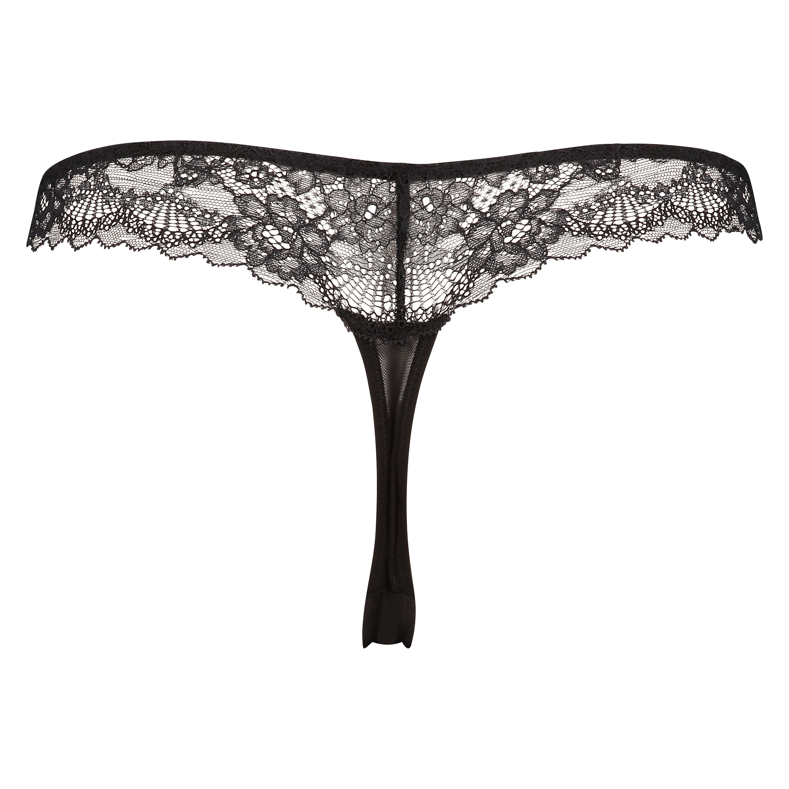 This sexy thong is black and is finished on the front with gorgeous lace with a floral motif and a small bow.