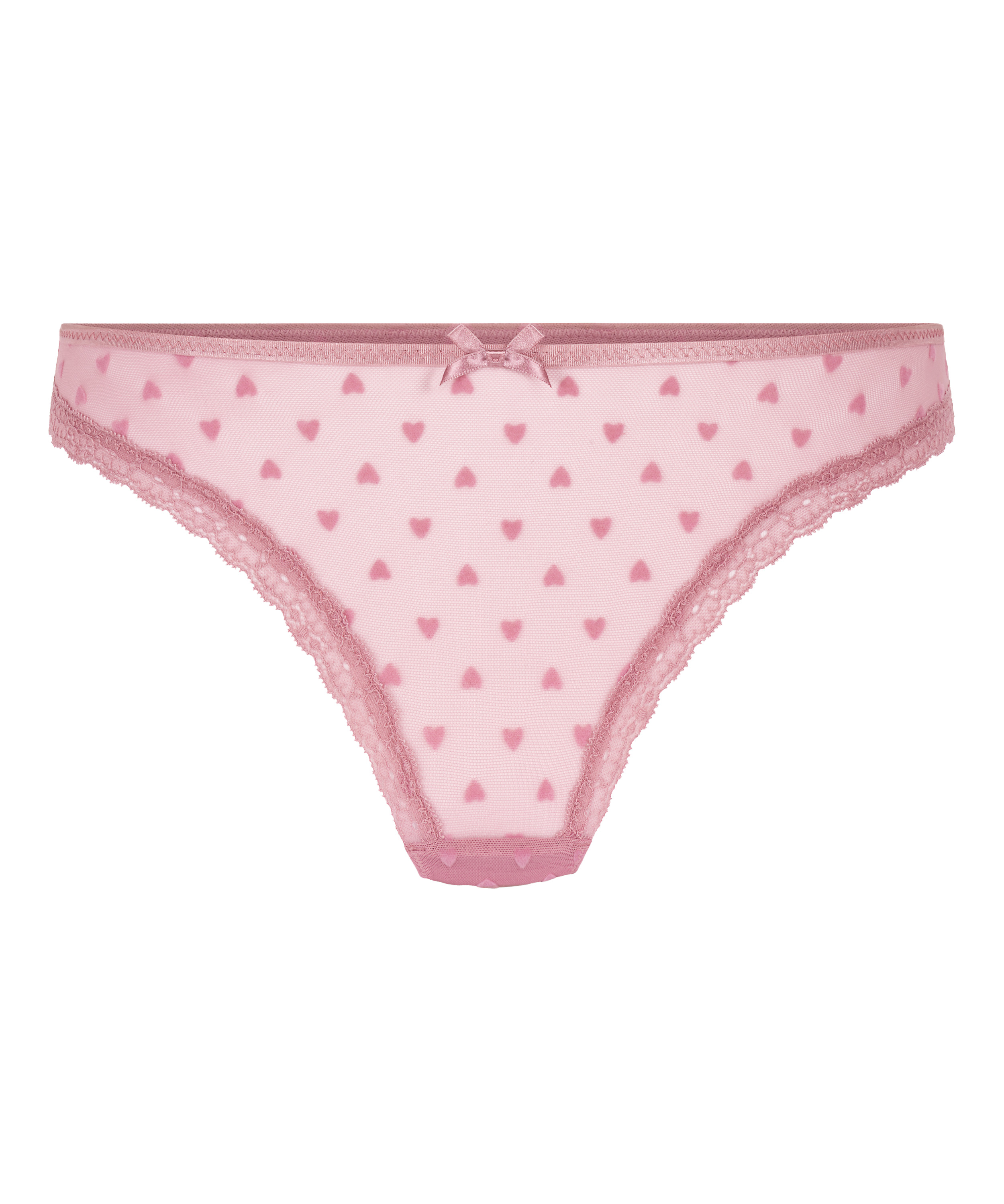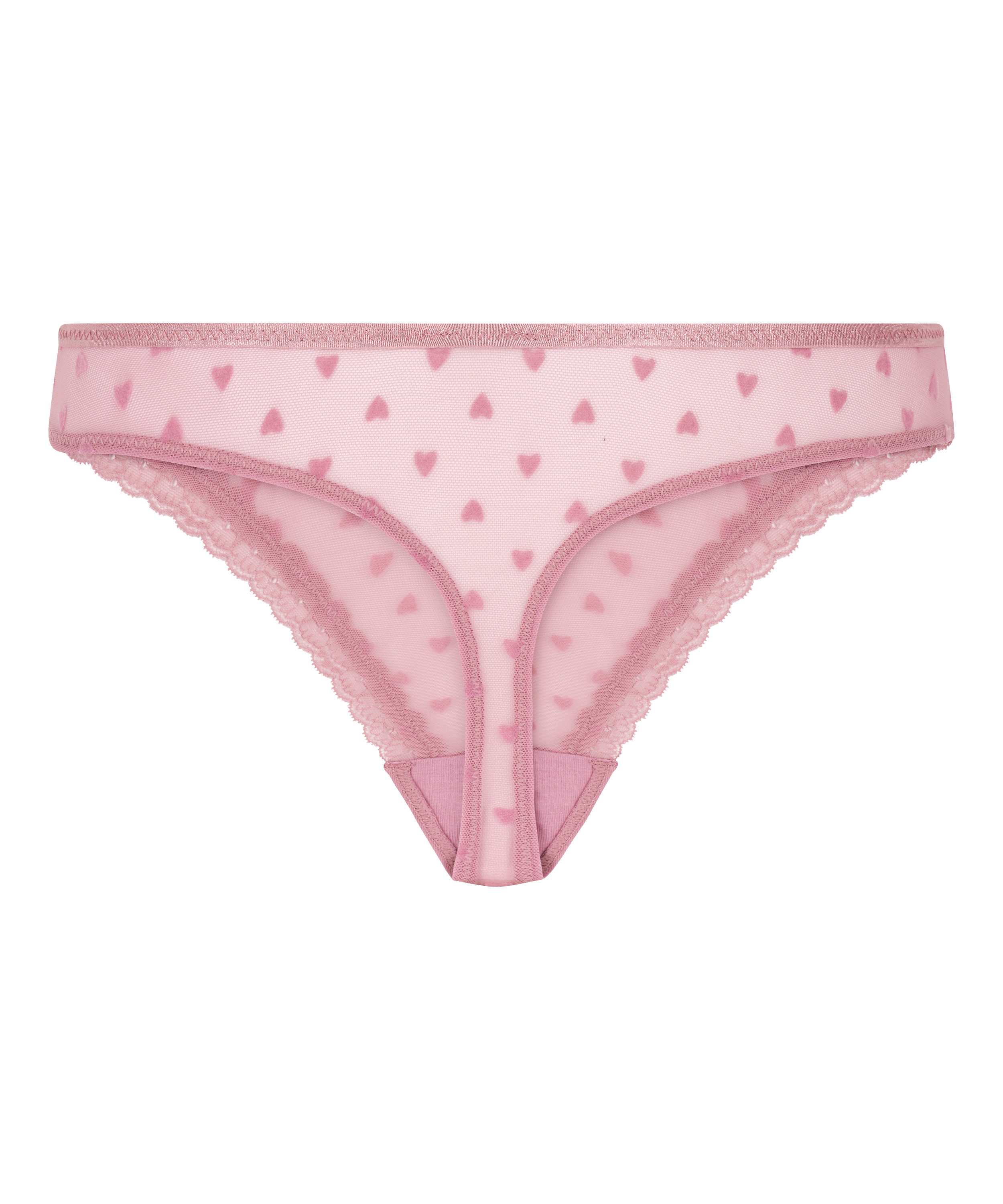 Siente la comodidad con este bonito tanga. El tanga tiene un borde de encaje y detalles con corazones de terciopelo. Combínala con tu sujetador favorito para lucir un conjunto completo.