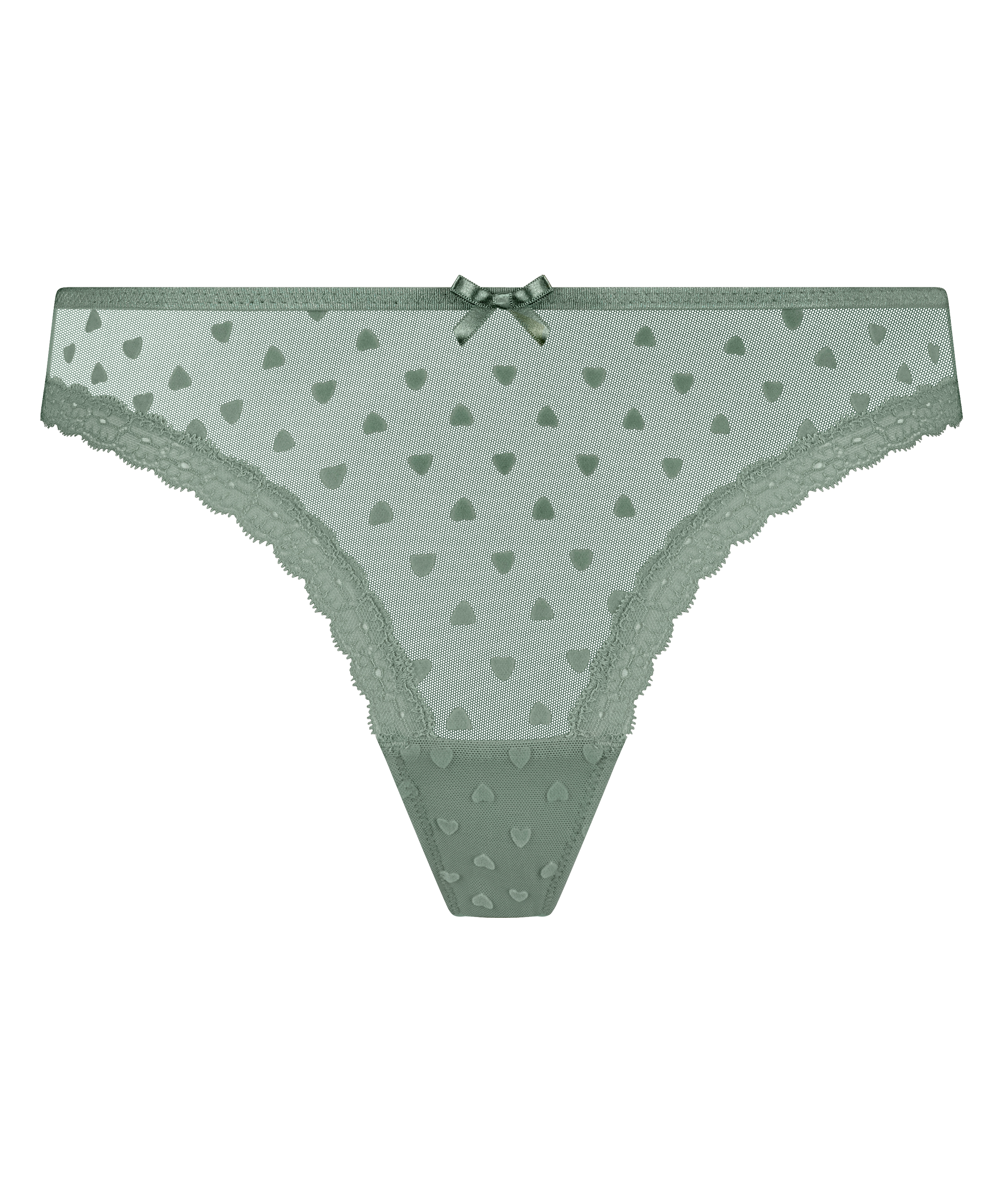 Siente la comodidad con este bonito tanga. El tanga tiene un borde de encaje y detalles con corazones de terciopelo. Combínala con tu sujetador favorito para lucir un conjunto completo.