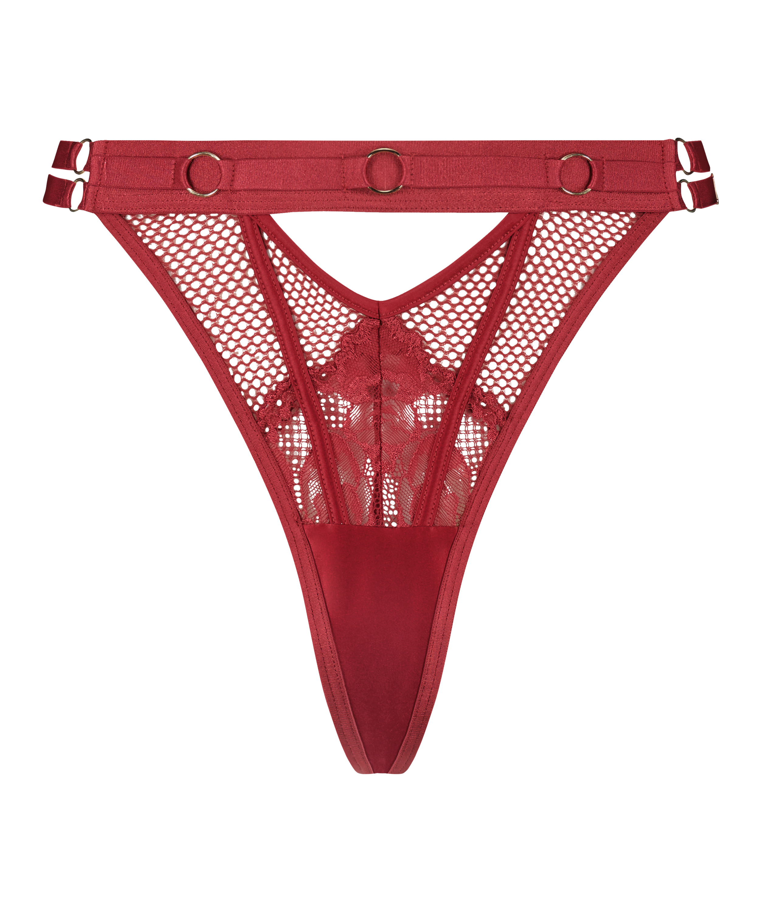 ¡Lleva las cosas al siguiente nivel con este tanga supersexi! Hecho con material de red, decorado con encaje y detalles de tiras para un «look» picante. Hay detalles recortados en la parte delantera y trasera, junto con los herrajes en la banda gruesa. ¡Encuentra el corpiño y completa el «look»!