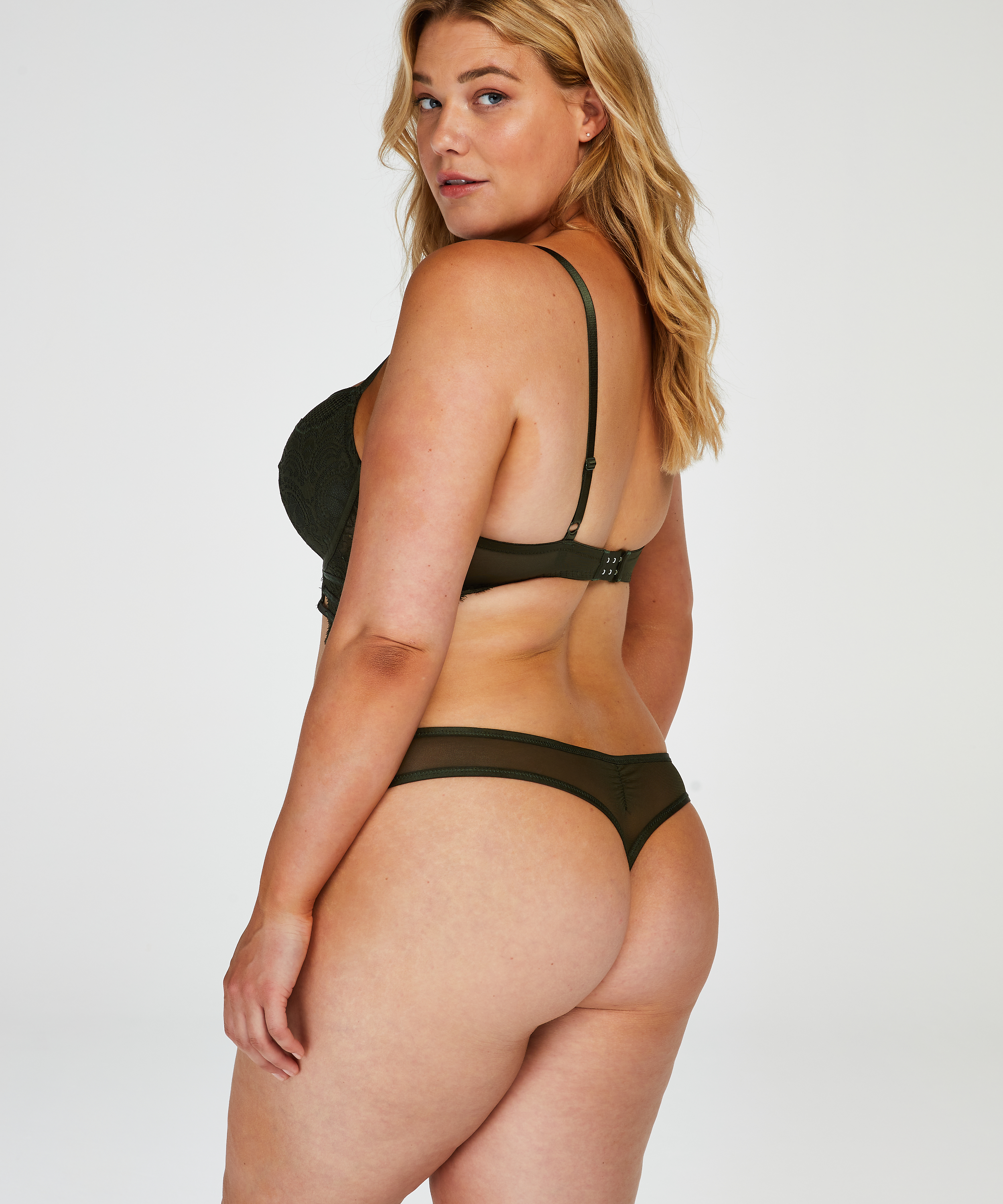 ¡Con este tanga resplanderás! Tiene un acabado de bonito encaje y tejido de rejilla en la parte trasera. ¡Combínala con el sujetador a juego para completar tu conjunto!