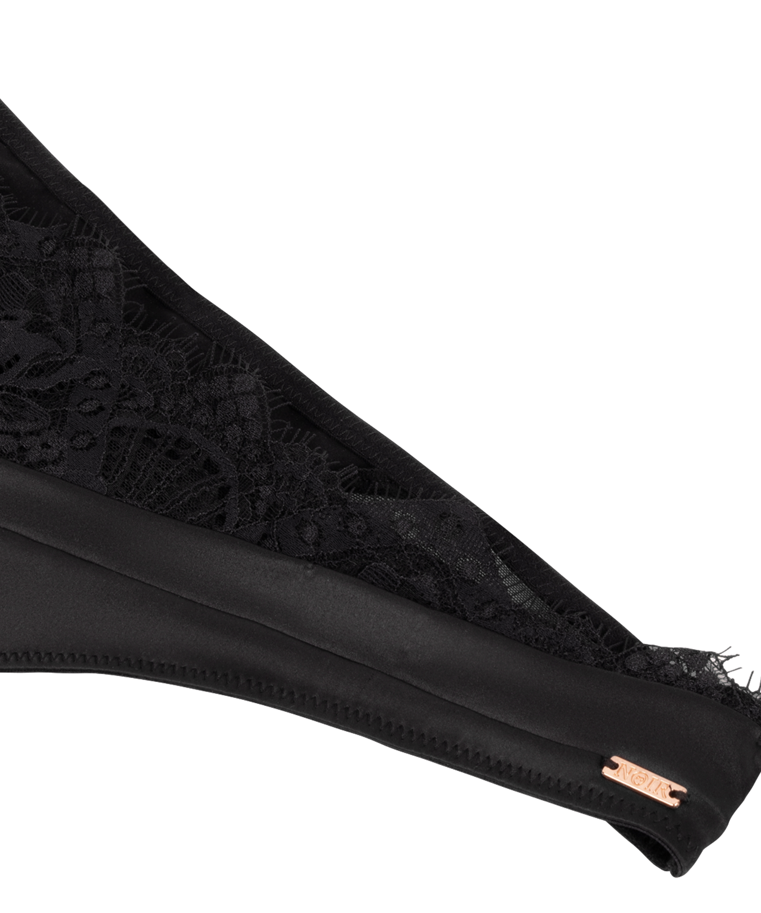 Completa tu conjunto con este tanga de bonito acabado. El tanga cuenta con bonitos y suntuosos detalles de encaje, satén y rejilla. Tiene un acabado de lacito. Forma parte de la colección Noir.