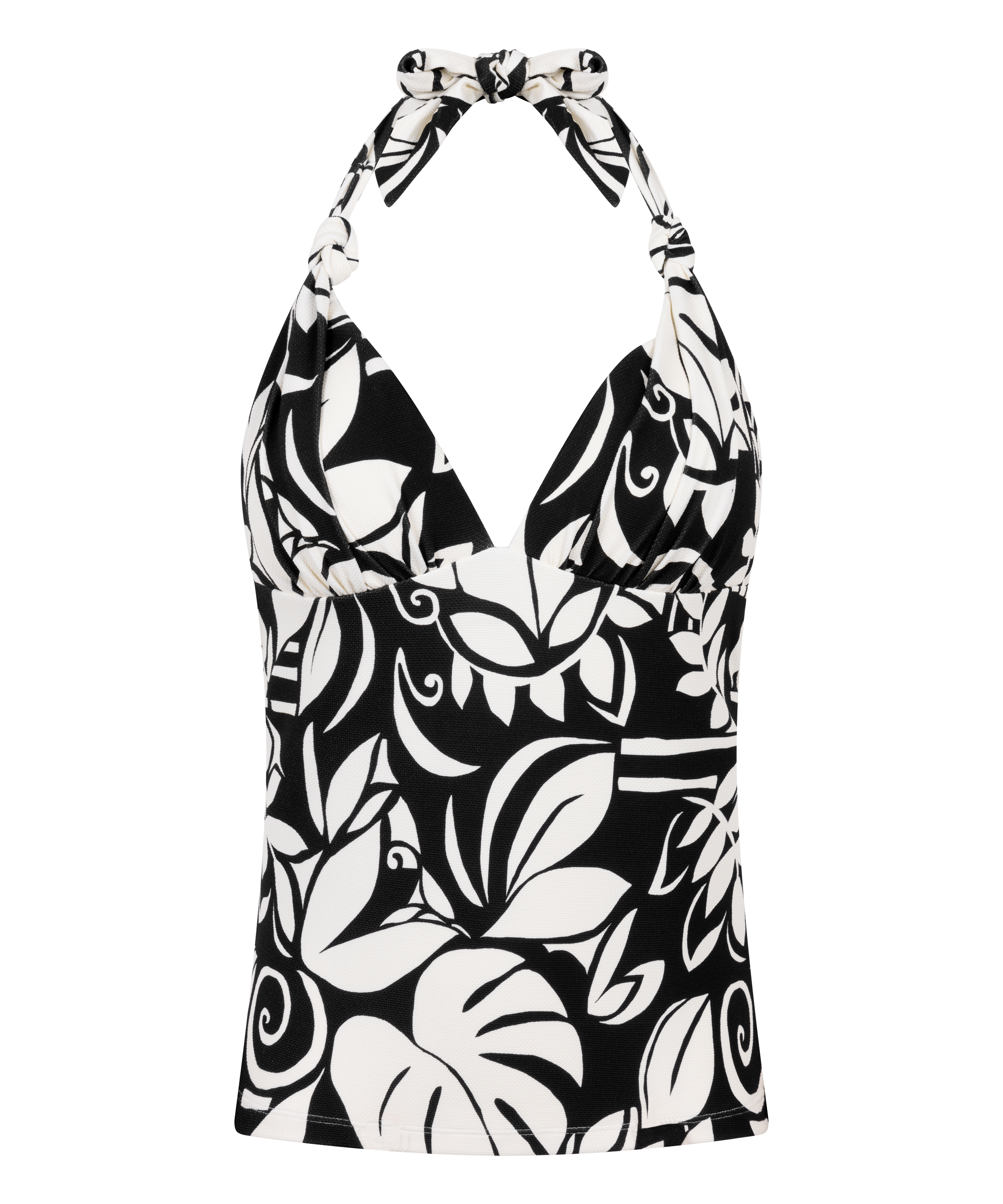 Este elegante tankini está diseñado para ofrecer comodidad y elegancia, con un corte favorecedor y un cierre de lazo en el cuello para un ajuste regulable y seguro. El diseño proporciona la cantidad justa de cobertura sin dejar de ser ligero y transpirable.