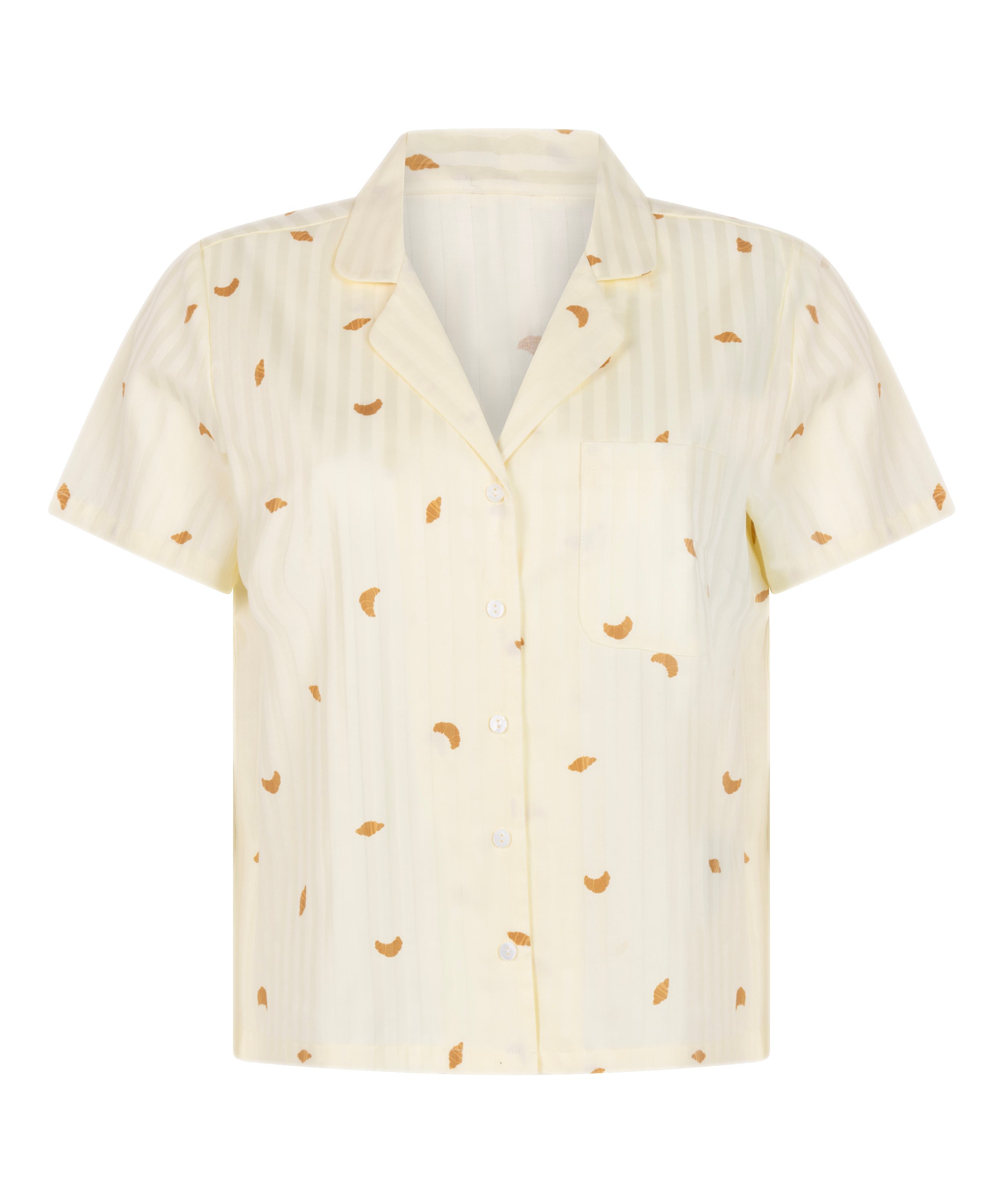 Mantente fresca y desenfadada con este top de pijama Jacket, un básico de estilo atemporal. Presenta cuello, cierre de botones y manga corta para un ajuste relajado. Se puede combinar con los shorts a juego para ir a conjunto.