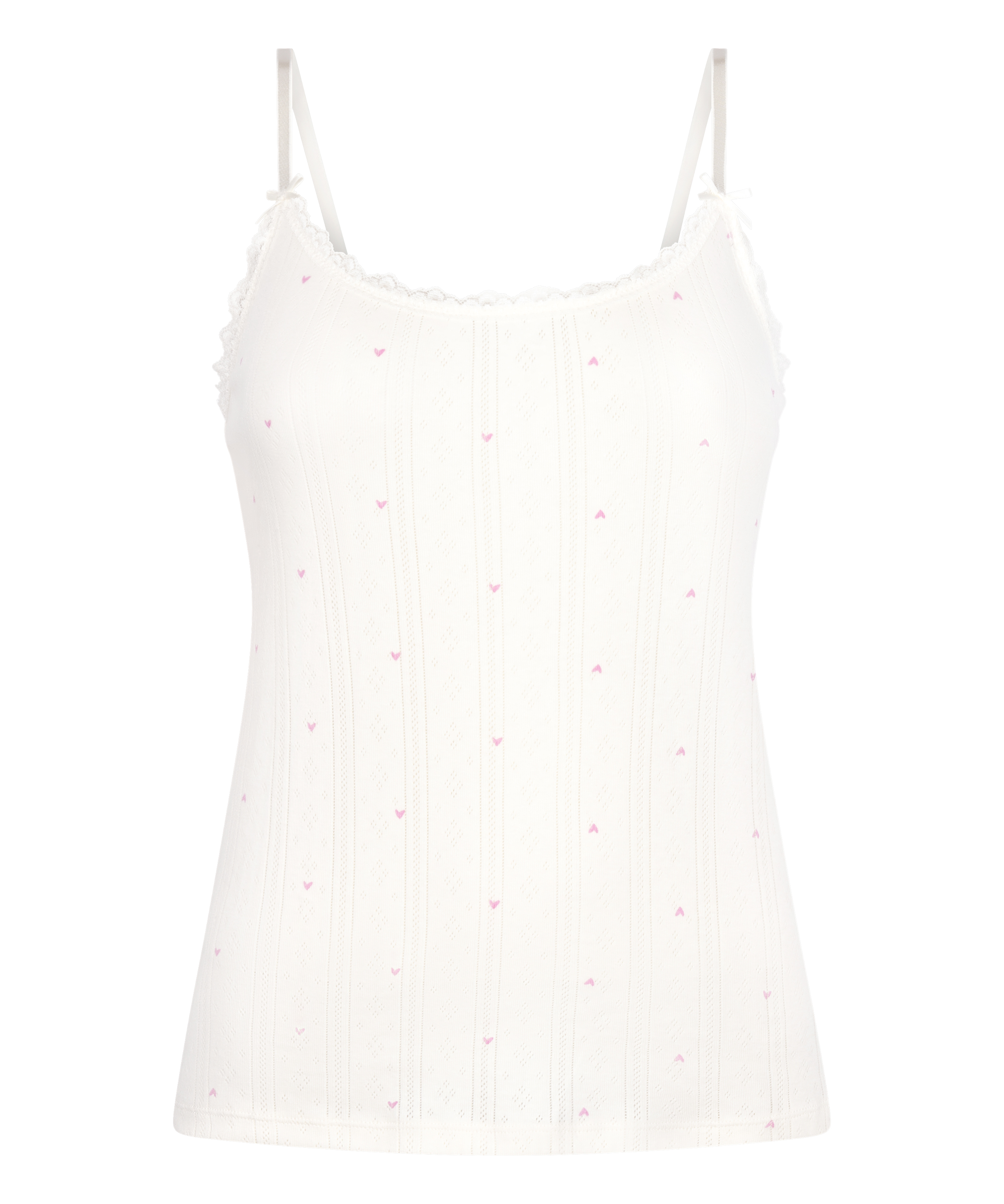 Si buscas una prenda dulce y transpirable, este top cami de pointelle es tu mejor opción. Confeccionado en suave algodón con pequeños detalles en forma de corazón y delicados tirantes, es perfecto para las noches más cálidas o para llevar debajo de tu cárdigan favorito. ¡Imprescindible en tu colección de prendas cómodas! Se puede combinar con los shorts o pantalones a juego para completar el look.