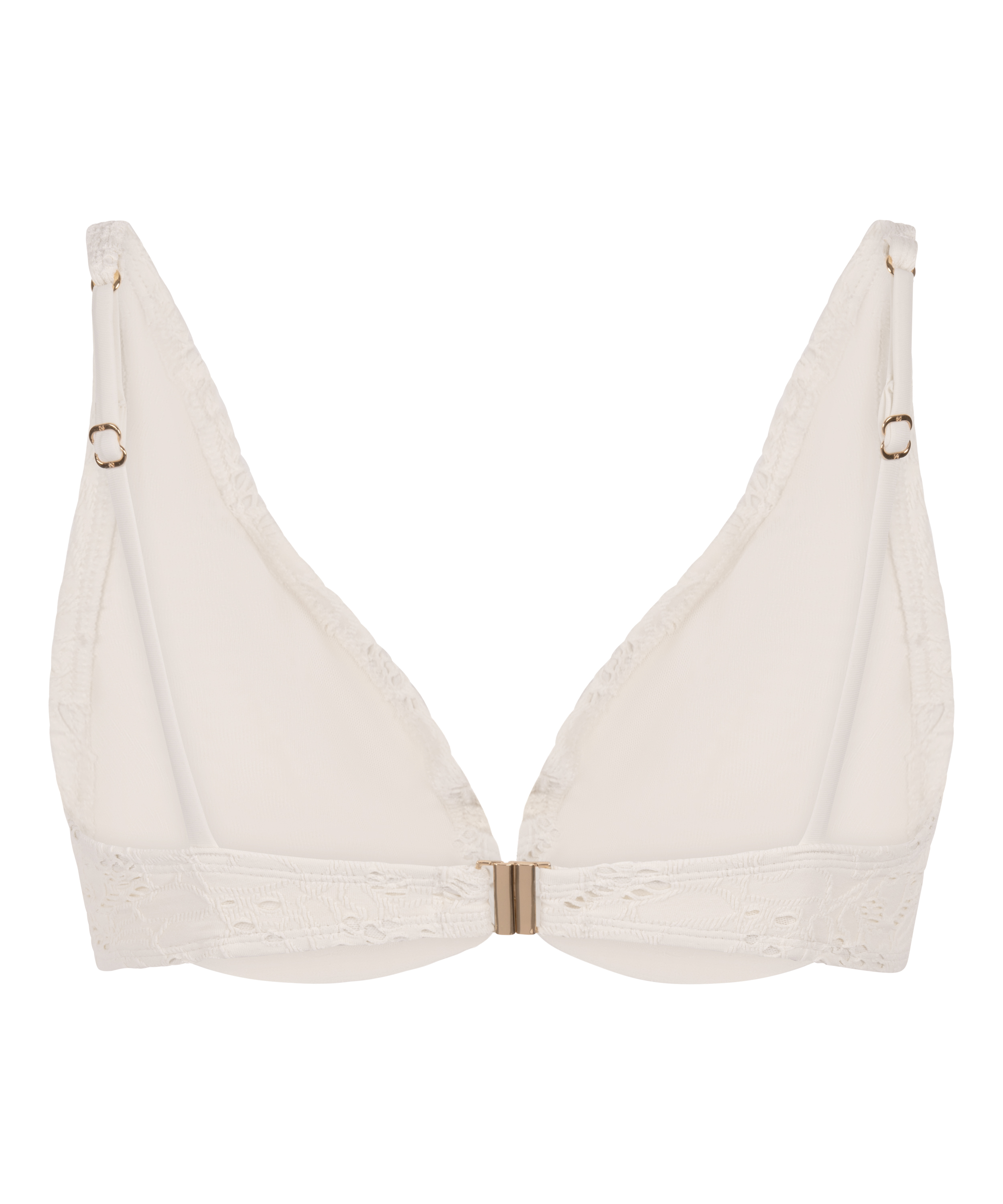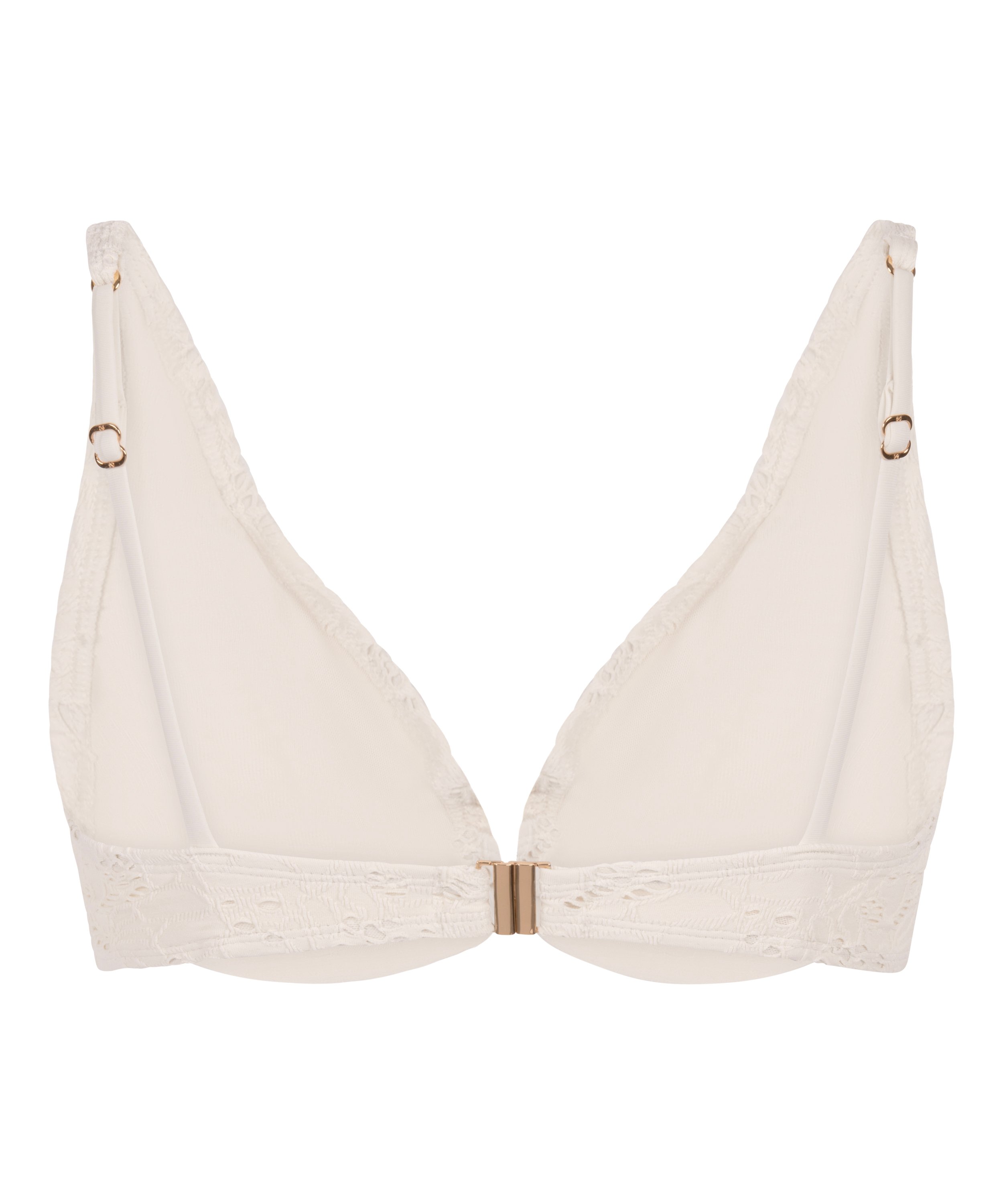 Este top de bikini de ganchillo sin aros y sin relleno combina el encanto artesanal con un toque de elegancia. Dispone de tirantes regulables, un cierre de clip seguro en la espalda y un detalle dorado delante, para ofrecer estilo y sujeción. Ideal para aquellas amantes de la lencería delicada y llamativa. Nuestros trajes de baño están confeccionados con tejidos y forros de alta calidad para ofrecer buena sujeción que se adapte a tu pecho. Si prefieres un ajuste más relajado, te recomendamos elegir una talla más.