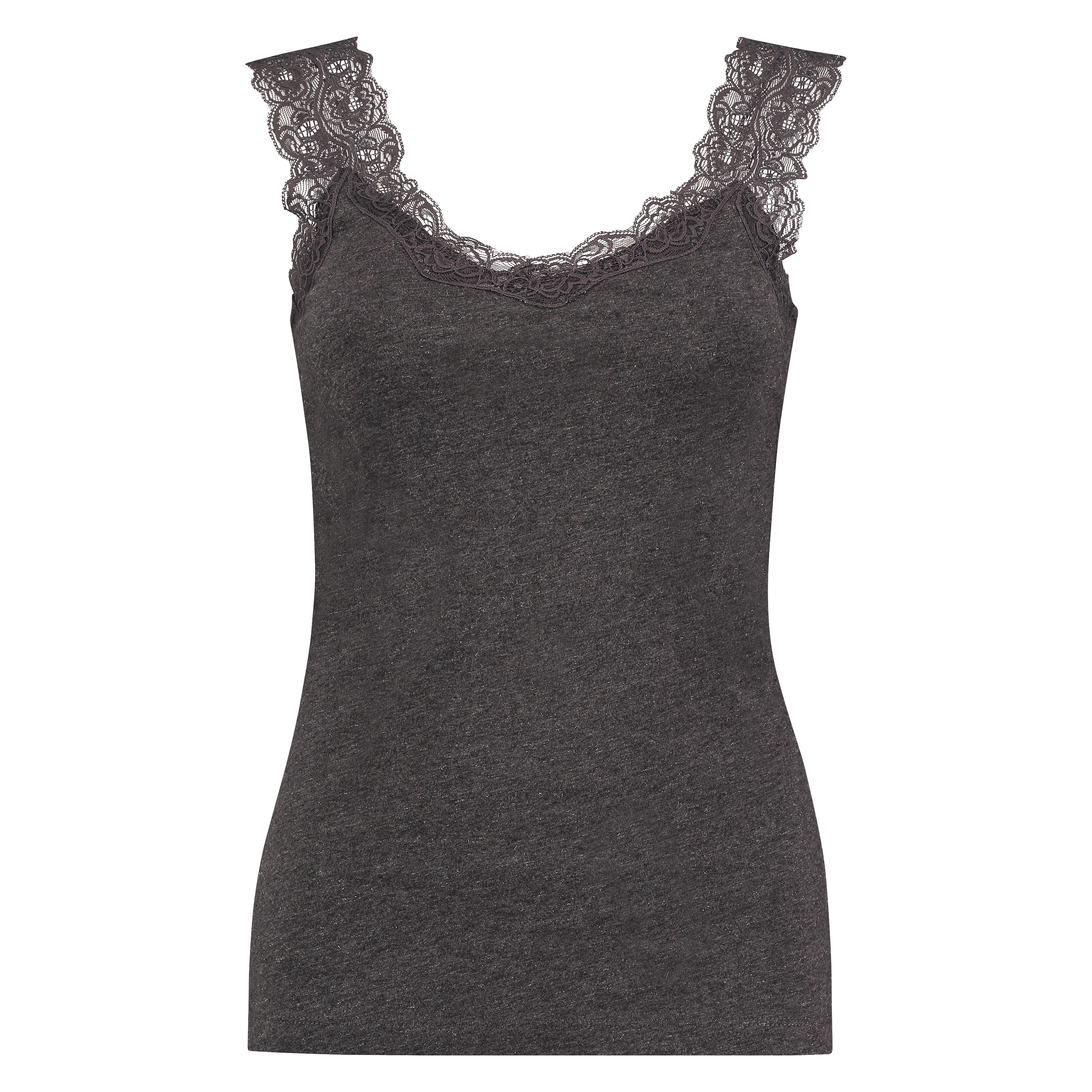 This singlet is a dark grey colour with small glitters and is finished with a lace border.