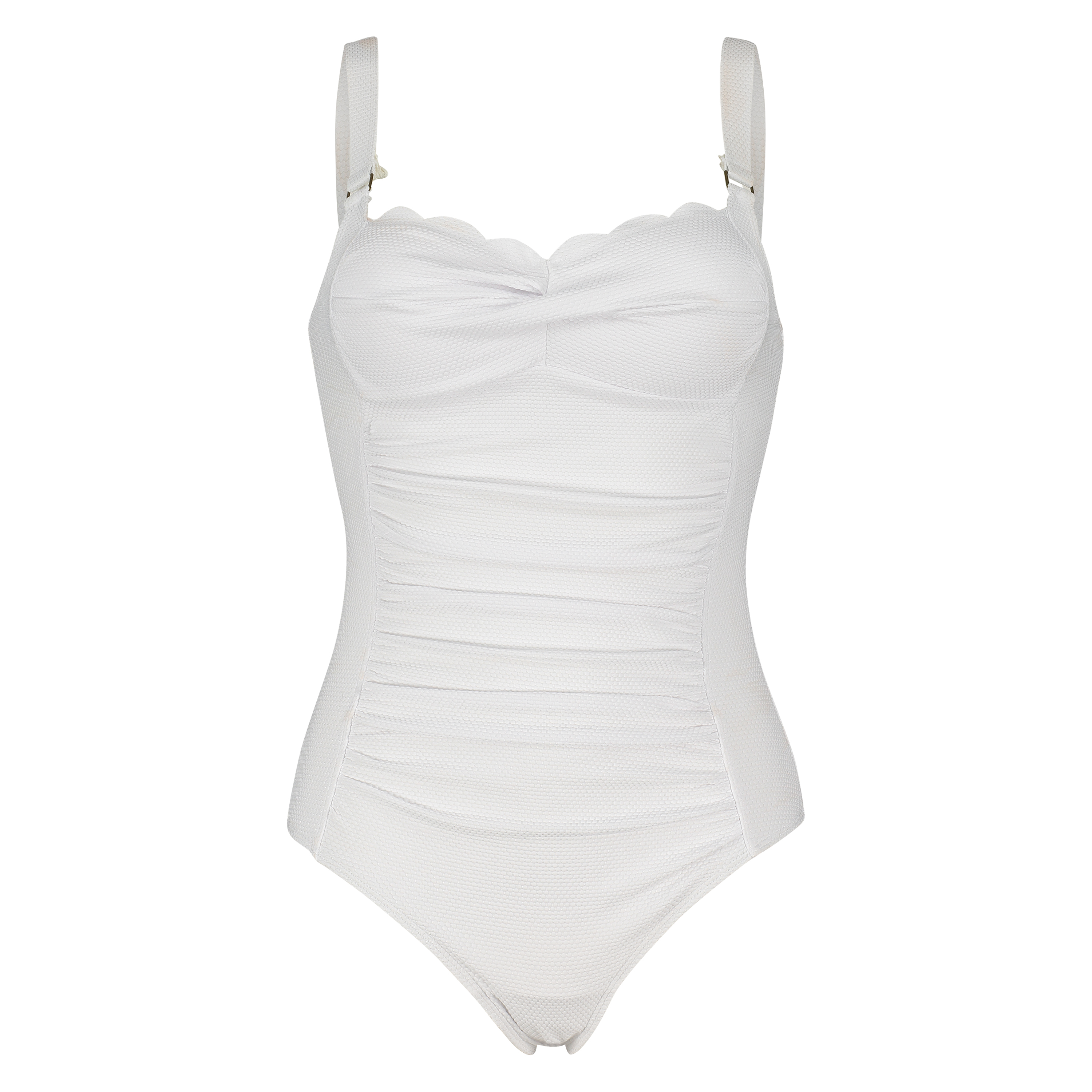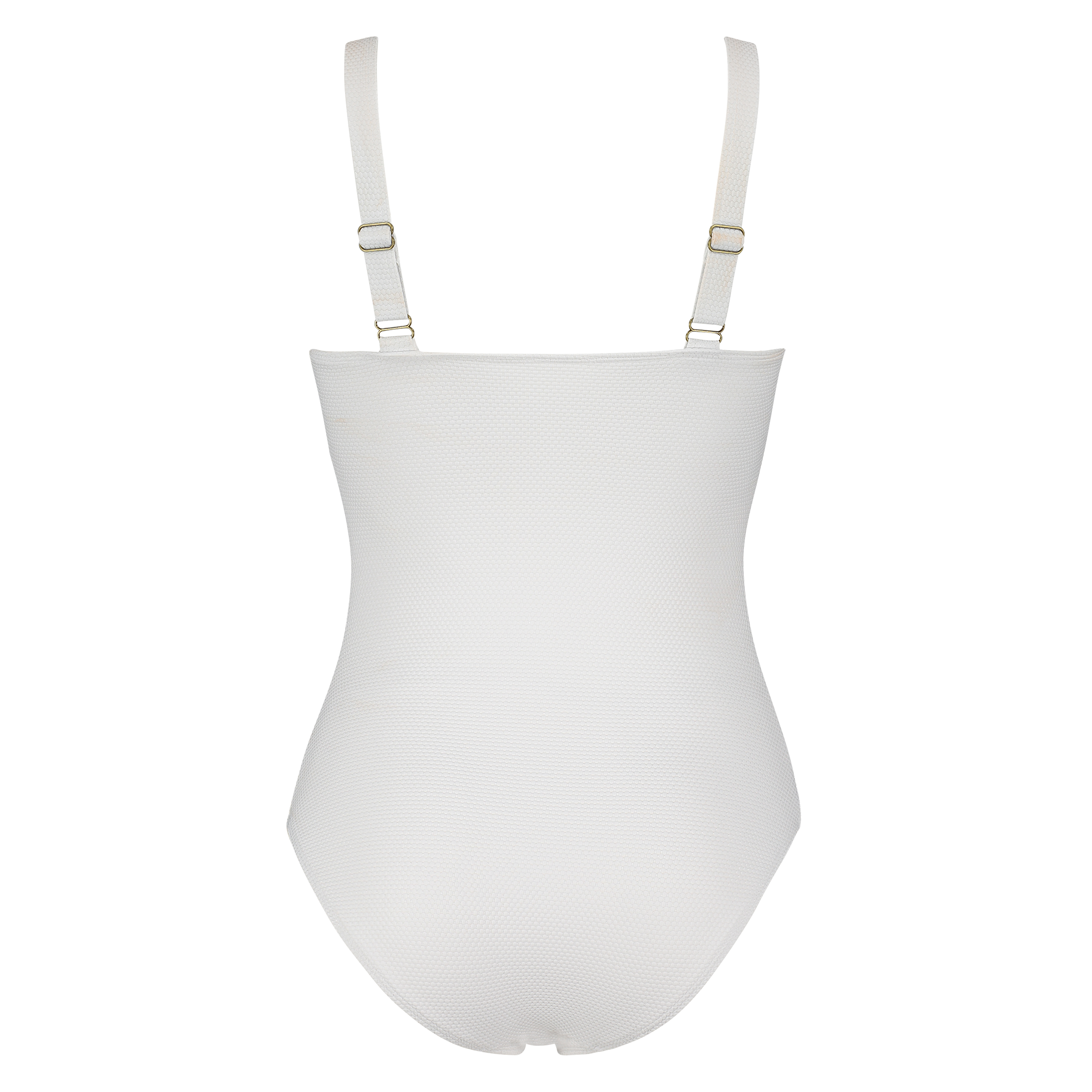 Este traje de baño está tejido con un bonito diseño. Cuenta con anchos tirantes, que hacen que sea muy cómodo. La parte superior de las copas tiene un acabado de decorativas formas.