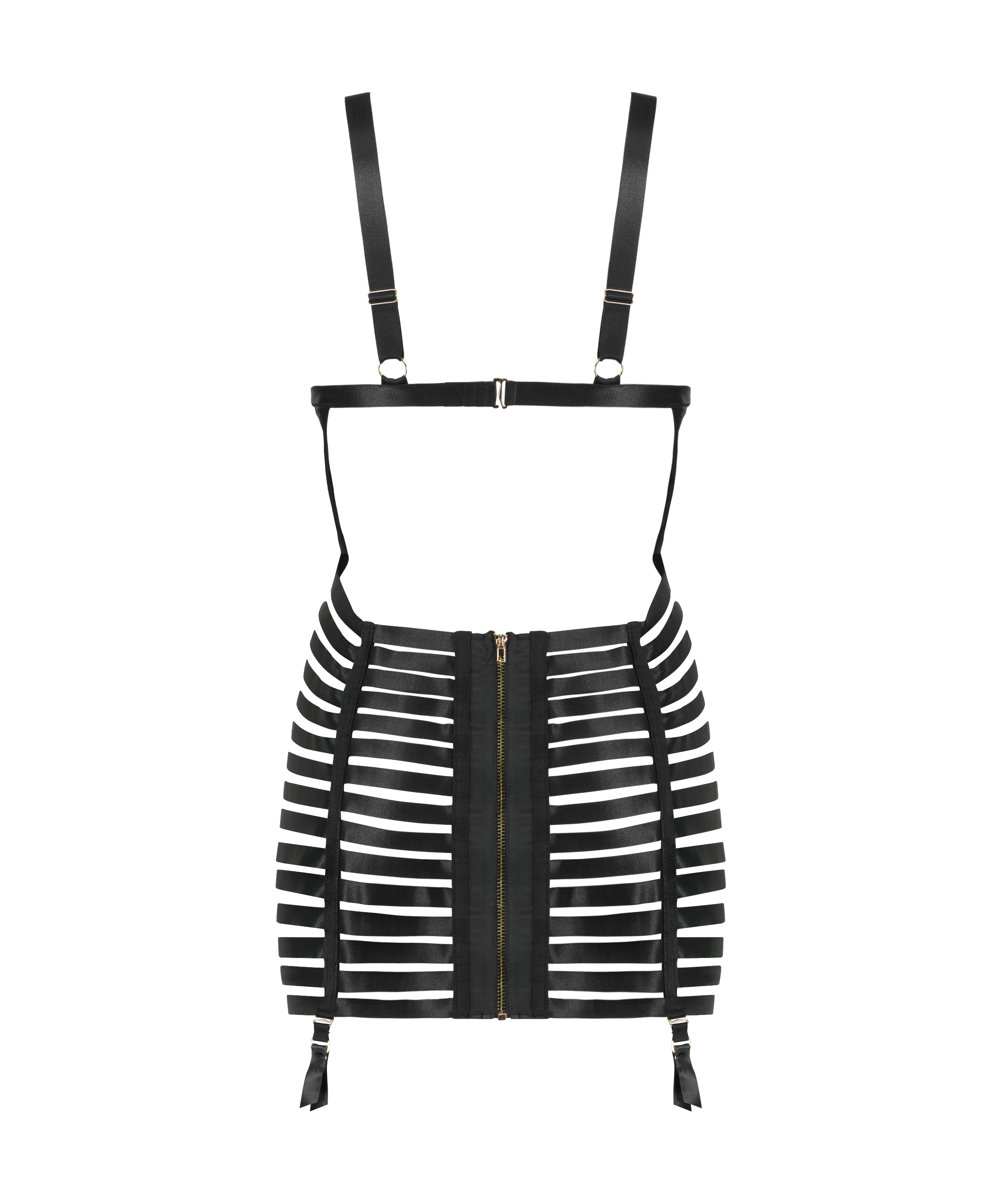 ¡Siéntete sexy con este delicioso vestido camisón! Tiene detalles de tirantes para un look provocativo. El vestido está confeccionado con tejido satinado en la parte delantera y tiene un cierre de cremallera en la parte trasera, junto con trabillas de liguero para sujetar tus medias favoritas. Forma parte de la colección Private.