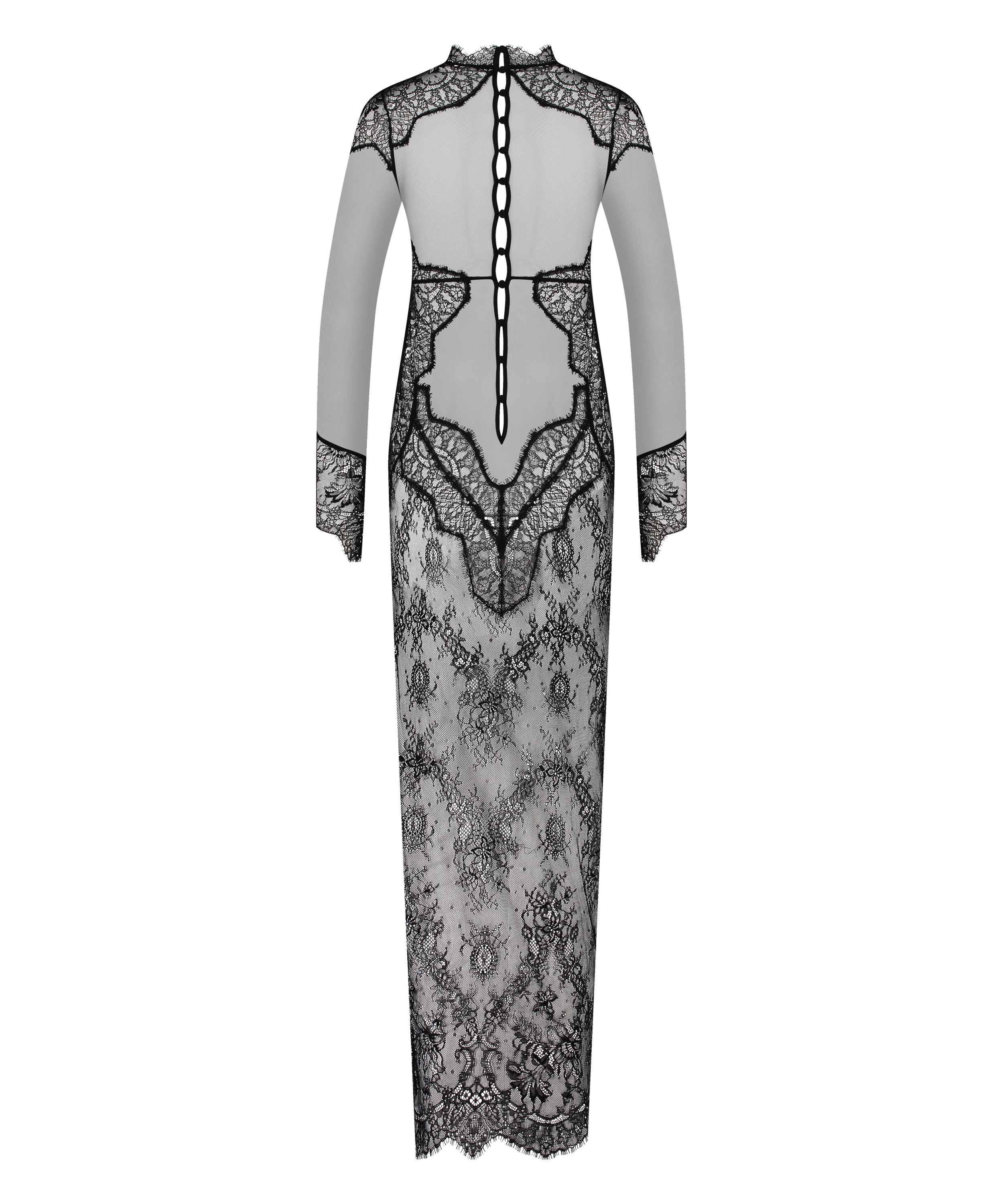 ¡Date un capricho de elegancia con este vestido largo! Esta cautivadora pieza cuenta con un top cubierto de malla con preciosos detalles de encaje y se complementa con una coqueta abertura lateral y un elegante cuello de tortuga. Desprende sofisticación y encanto con sus mangas largas y su cierre de botones en la espalda. ¡Combínalo con tu conjunto de lencería favorito para completar tu look!