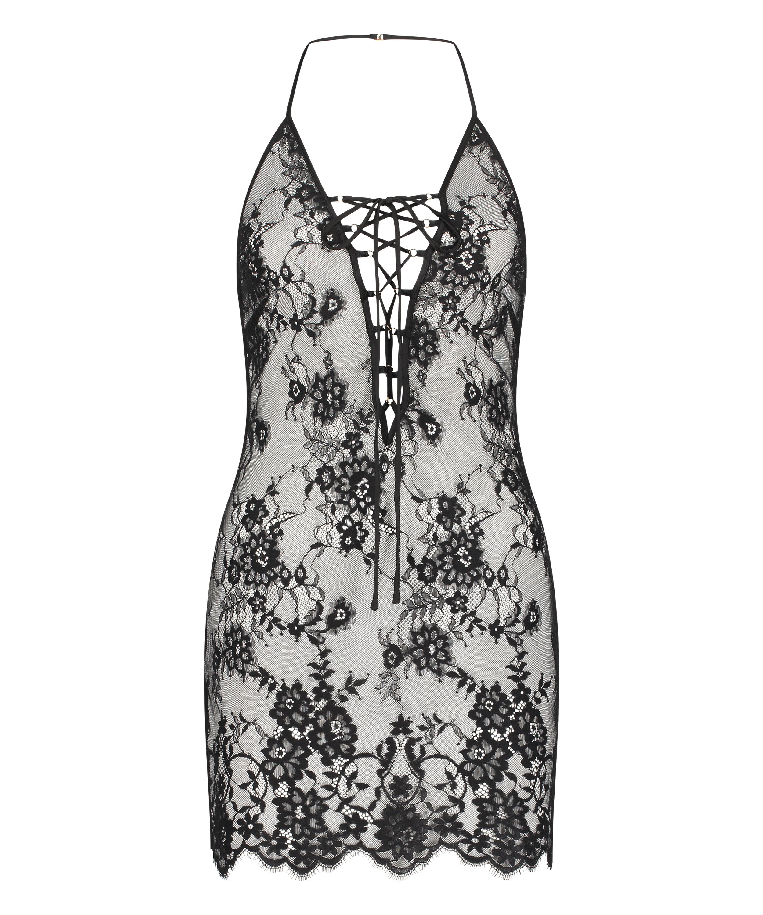 Luce un look fabuloso con nuestro vestido combinación de encaje con cuello halter. Confeccionado en un tejido de encaje, este vestido semitransparente tiene cuello halter. Combínalo con un bonito kimono para completar tu look de noche.
