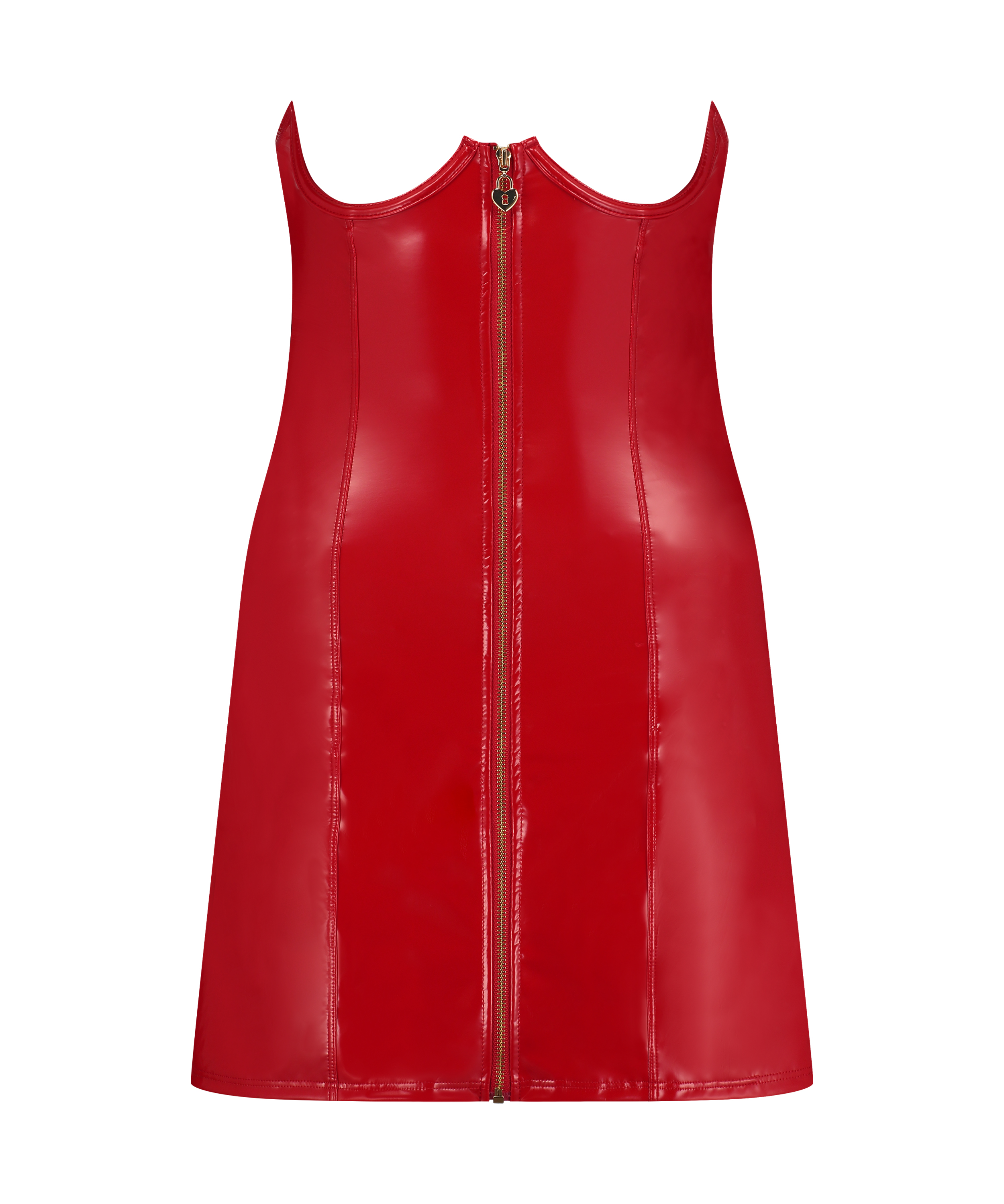Despierta el deseo con este deslumbrante vestido lencero. Está hecho de piel sintética y tiene un cierre de cremallera en la parte delantera. Este vestido tiene aros para un look extra sexy. Combínala con accesorios sexis. Forma parte de nuestra colección Private.